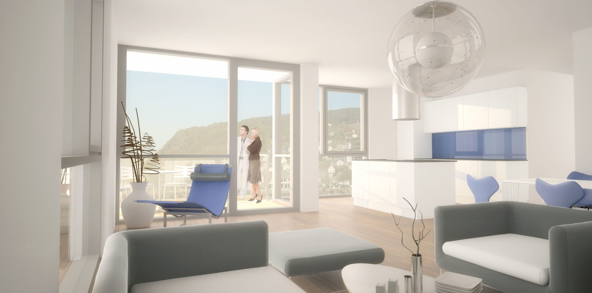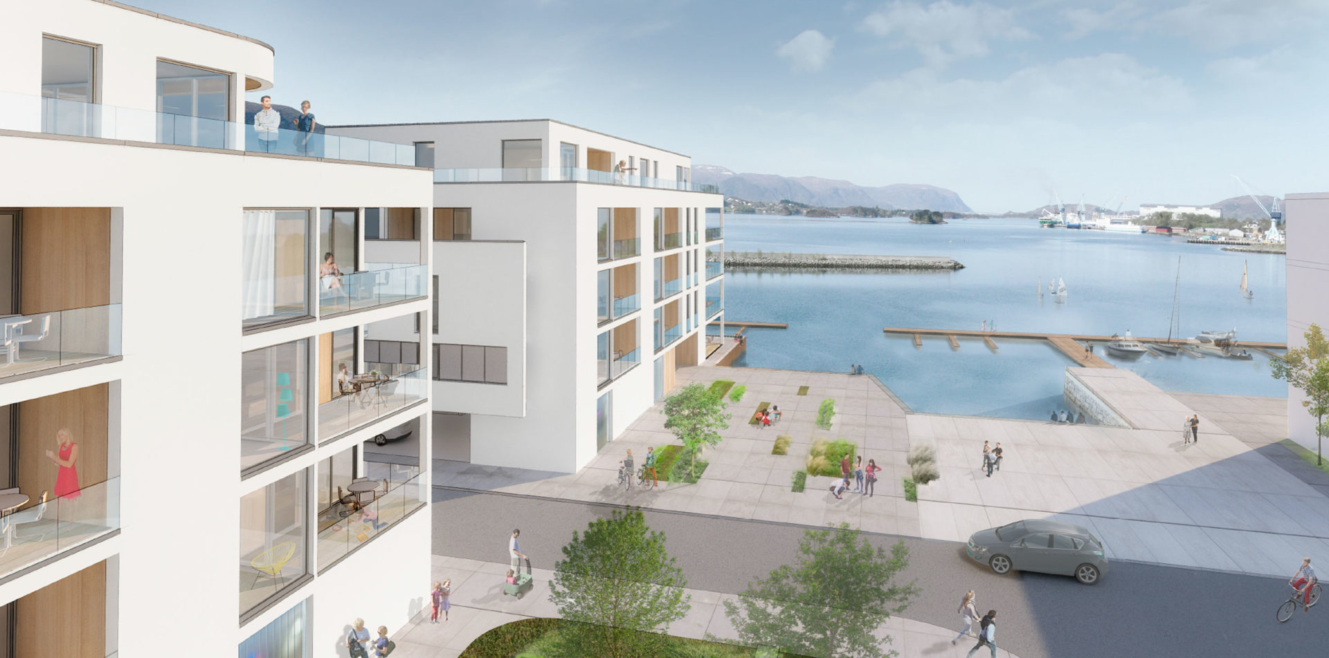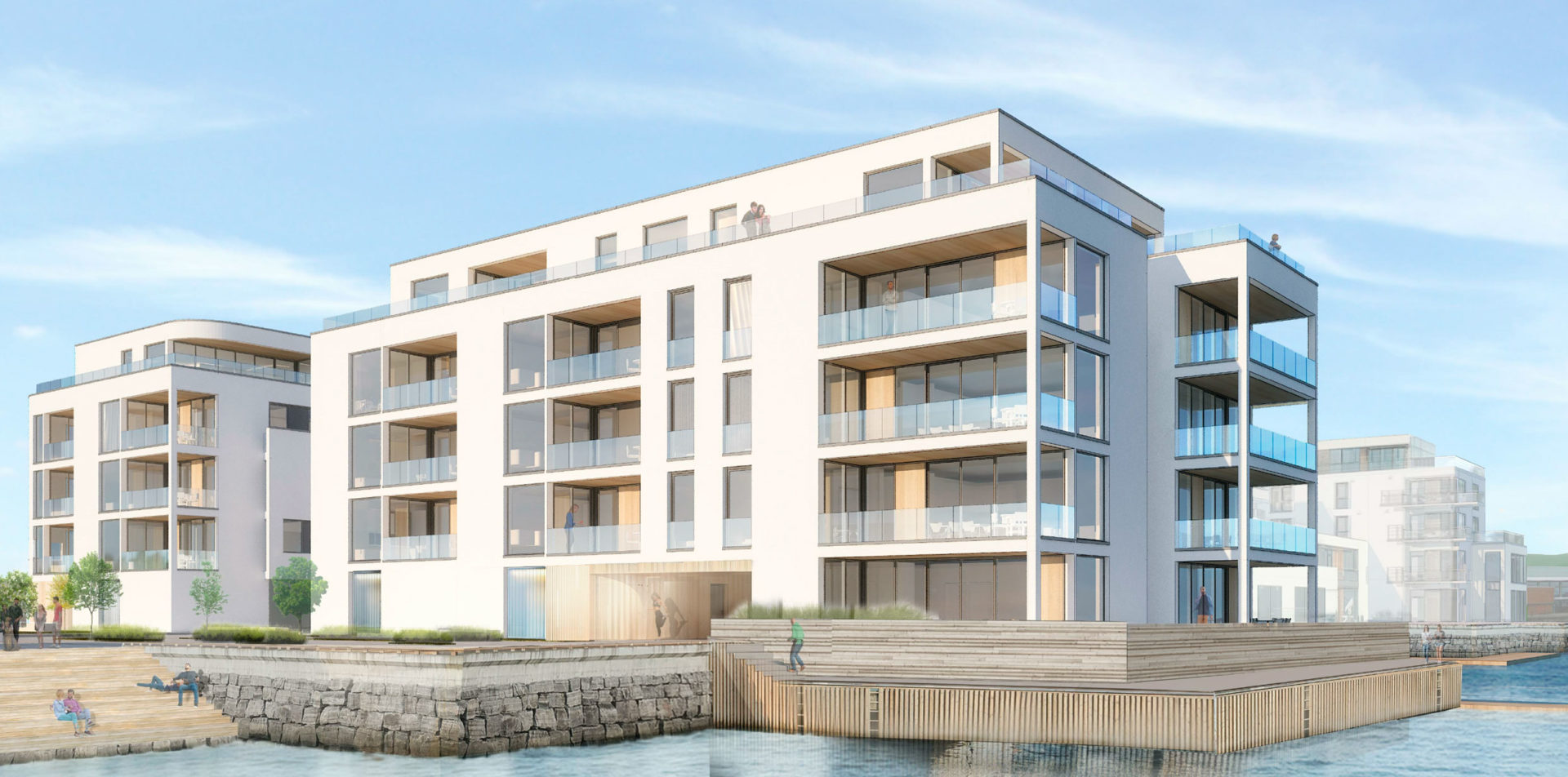 Materialvalget gir bygget eit lyst og lett preg som gjer at det til alle årstider vil reflektere lyset rundt seg og vere eit vakkert blikkfang i sjøkanten. Leilighetene har gode terasser i kontakt med sjø og utsikt.